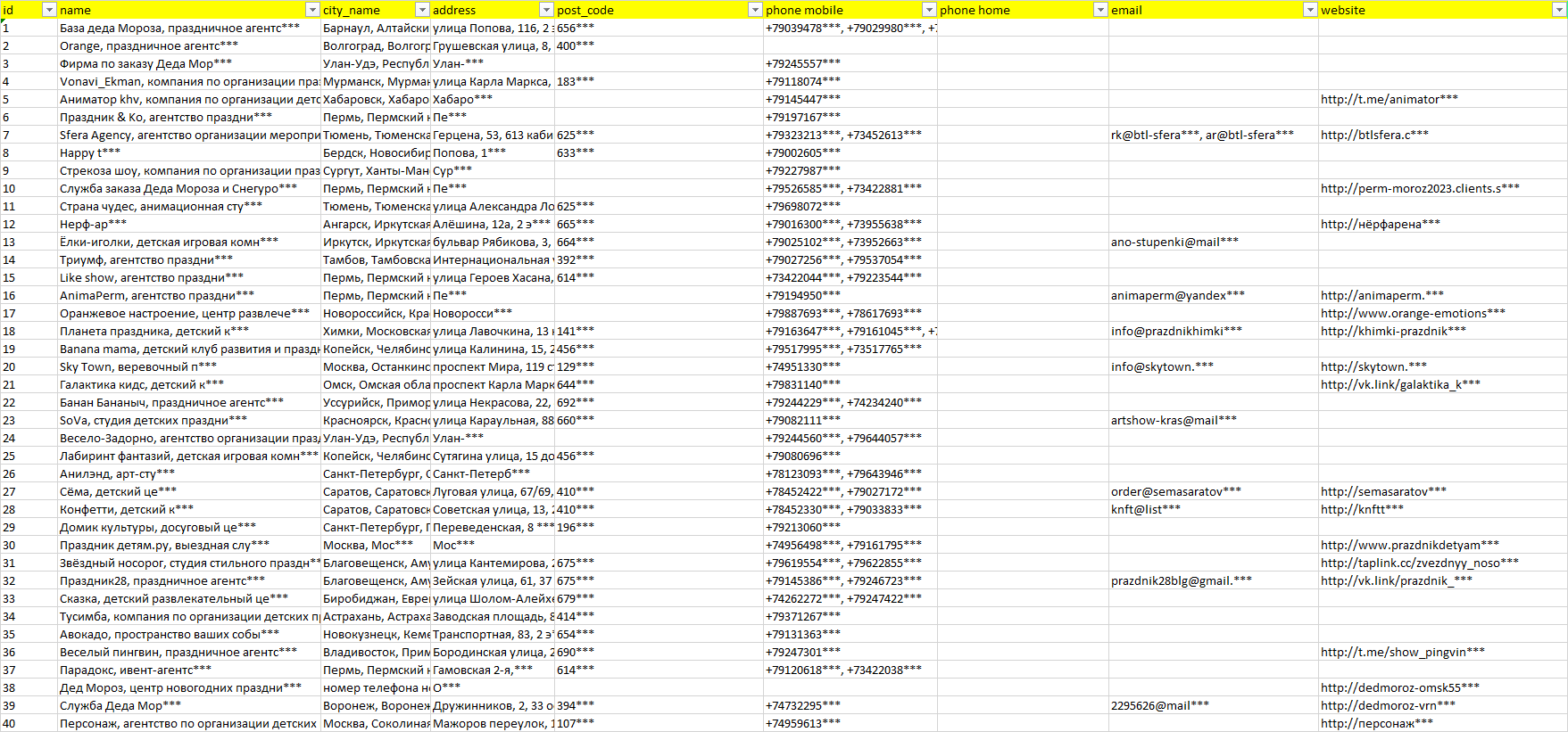База компаний услуги деда мороза, вся РФ в формате Excel с эл. почтами, телефонами, сайтами, ссылками на соц сети, координатами и другой информацией. Скачайте демо версию, чтобы ознакомиться с данными.