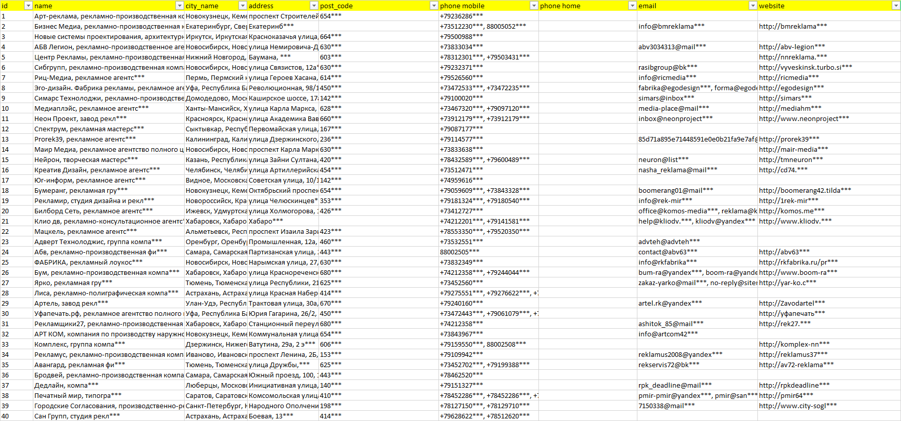 База организаций согласование наружной рекламы, вся Россия в формате Excel с эл. почтами, телефонами, сайтами, ссылками на соц сети, координатами и другой информацией. Скачайте демо версию, чтобы ознакомиться с данными.
