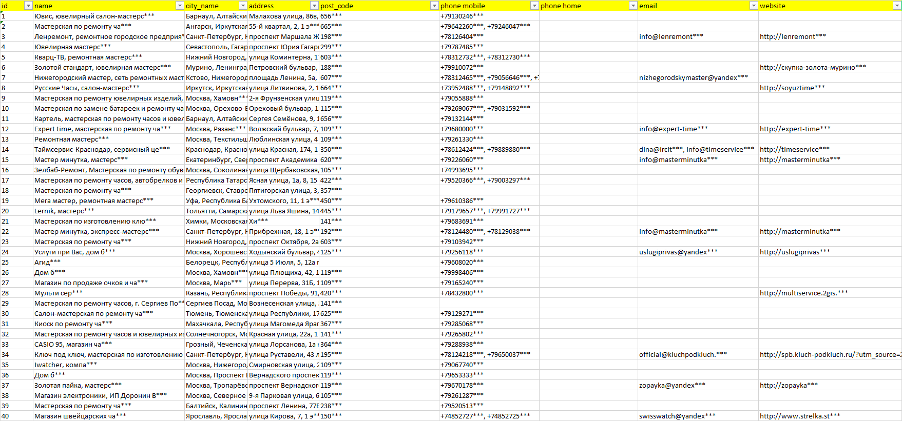 База компаний ремонт часов, вся РФ в формате Excel с эл. почтами, телефонами, сайтами, ссылками на соц сети, координатами и другой информацией. Скачайте демо версию, чтобы ознакомиться с данными.