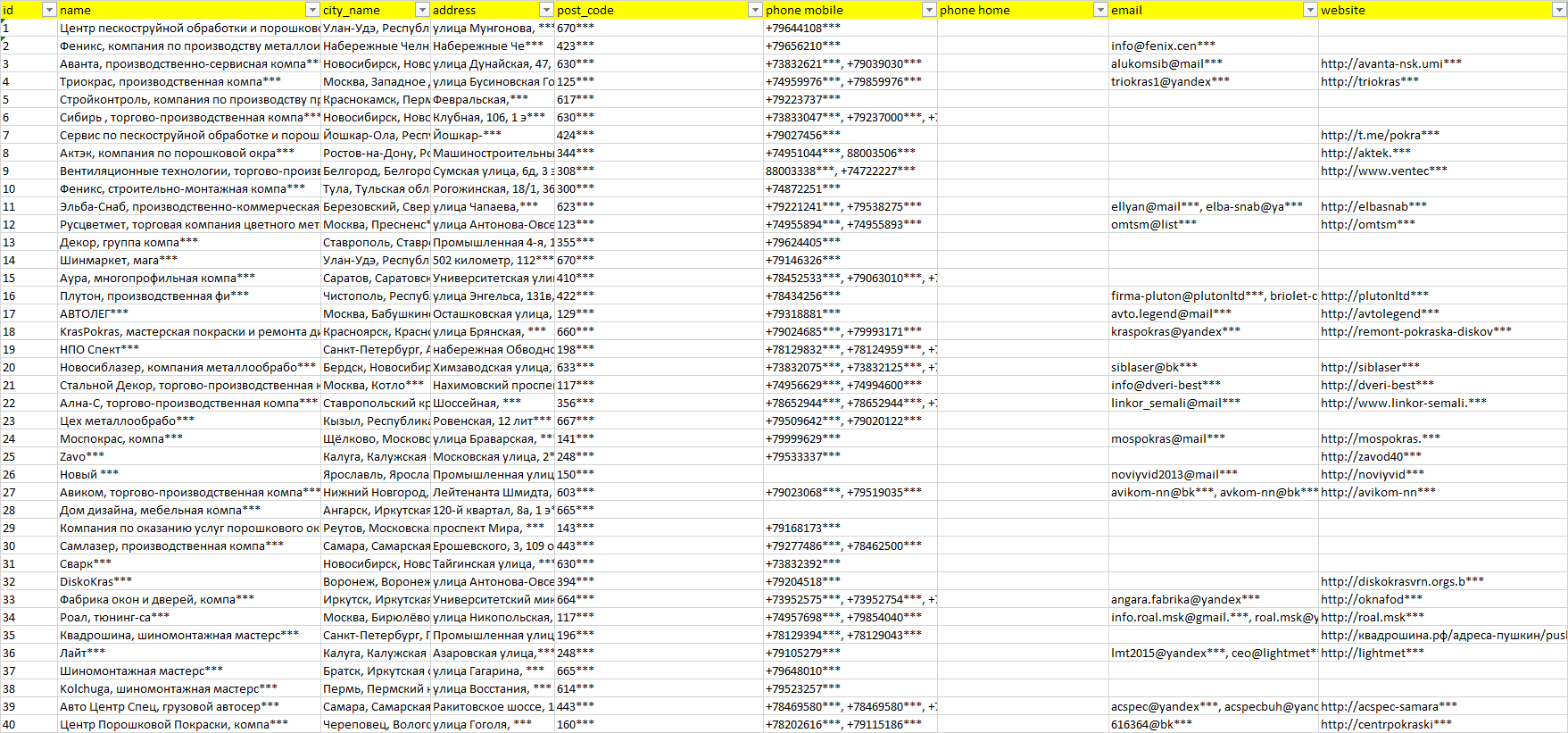 База компаний полимерная порошковая окраска, вся РФ в формате Excel с эл. почтами, телефонами, сайтами, ссылками на соц сети, координатами и другой информацией. Скачайте демо версию, чтобы ознакомиться с данными.