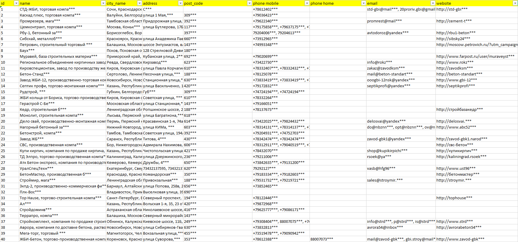 База организаций железобетонные изделия, вся Россия в формате Excel с эл. почтами, телефонами, сайтами, ссылками на соц сети, координатами и другой информацией. Скачайте демо версию, чтобы ознакомиться с данными.