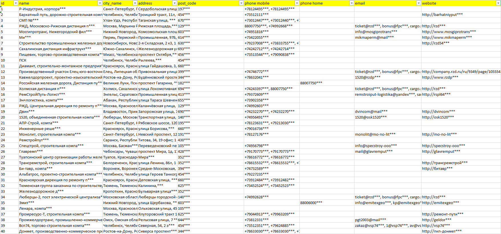 База организаций строительство железных дорог, вся Россия в формате Excel с эл. почтами, телефонами, сайтами, ссылками на соц сети, координатами и другой информацией. Скачайте демо версию, чтобы ознакомиться с данными.