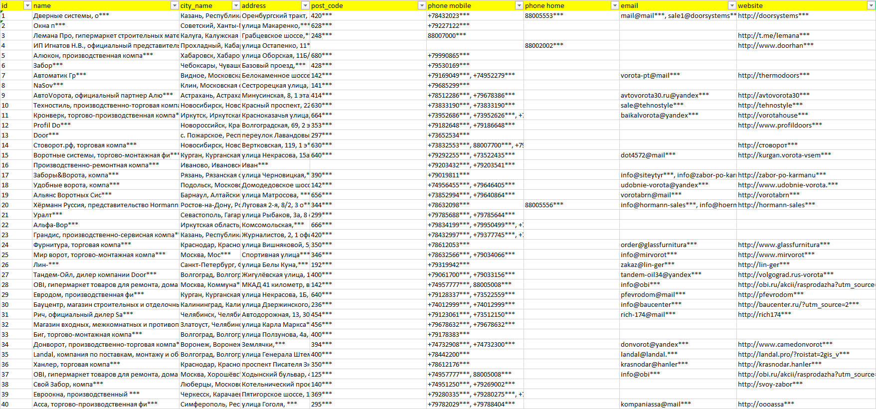 База компаний автоматические двери, вся РФ в формате Excel с эл. почтами, телефонами, сайтами, ссылками на соц сети, координатами и другой информацией. Скачайте демо версию, чтобы ознакомиться с данными.