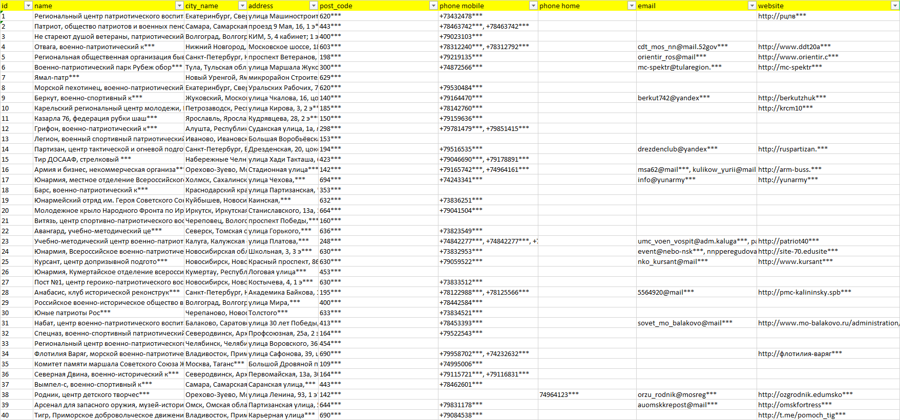 База организаций военно-патриотические клубы, вся Россия в формате Excel с эл. почтами, телефонами, сайтами, ссылками на соц сети, координатами и другой информацией. Скачайте демо версию, чтобы ознакомиться с данными.