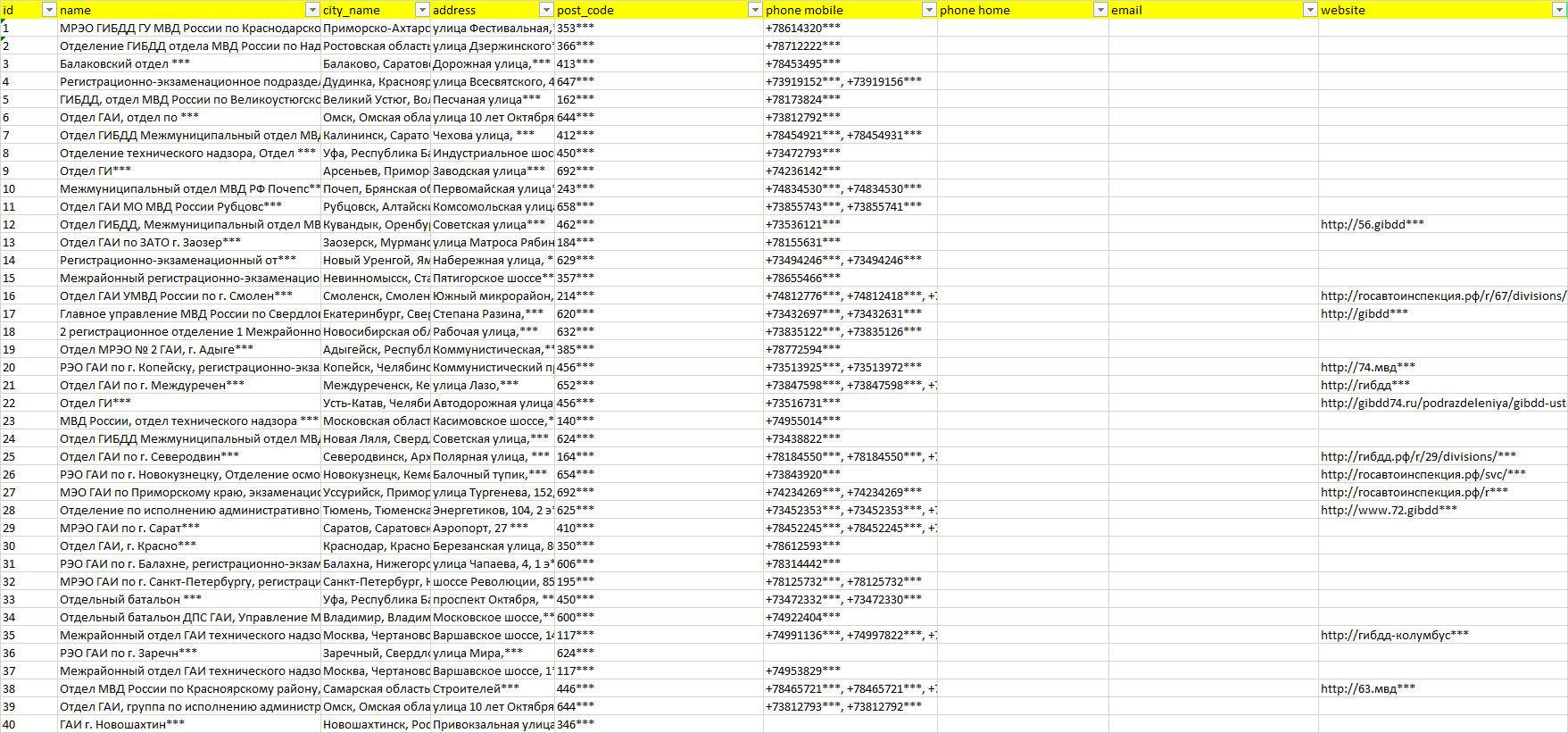 База компаний гаи, вся РФ в формате Excel с эл. почтами, телефонами, сайтами, ссылками на соц сети, координатами и другой информацией. Скачайте демо версию, чтобы ознакомиться с данными.