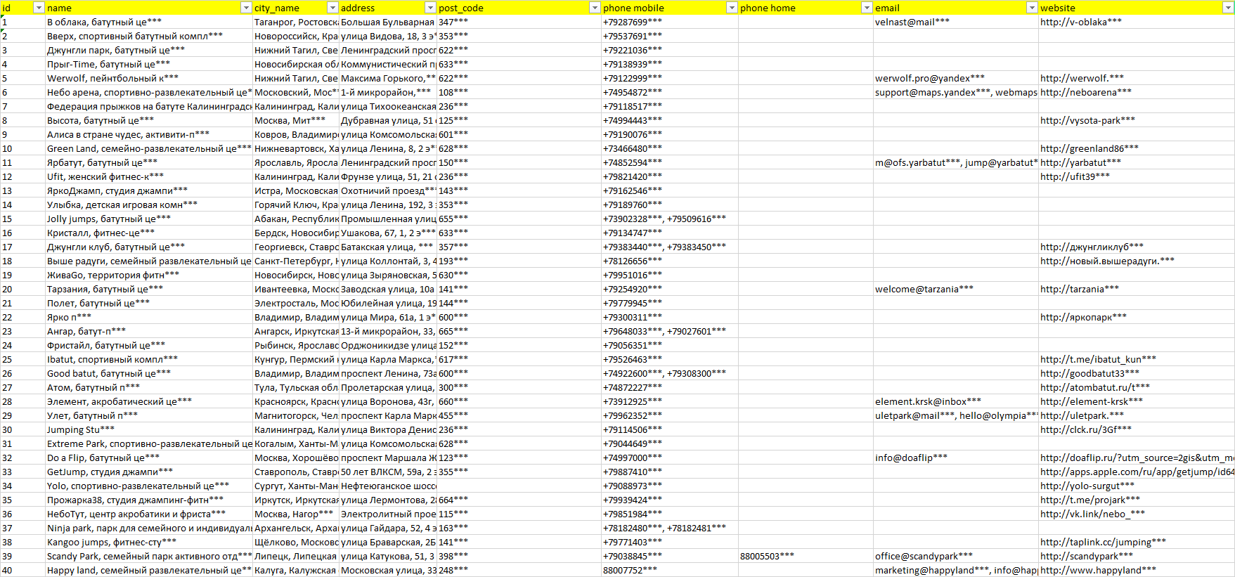 База компаний батутные центры, вся РФ в формате Excel с эл. почтами, телефонами, сайтами, ссылками на соц сети, координатами и другой информацией. Скачайте демо версию, чтобы ознакомиться с данными.