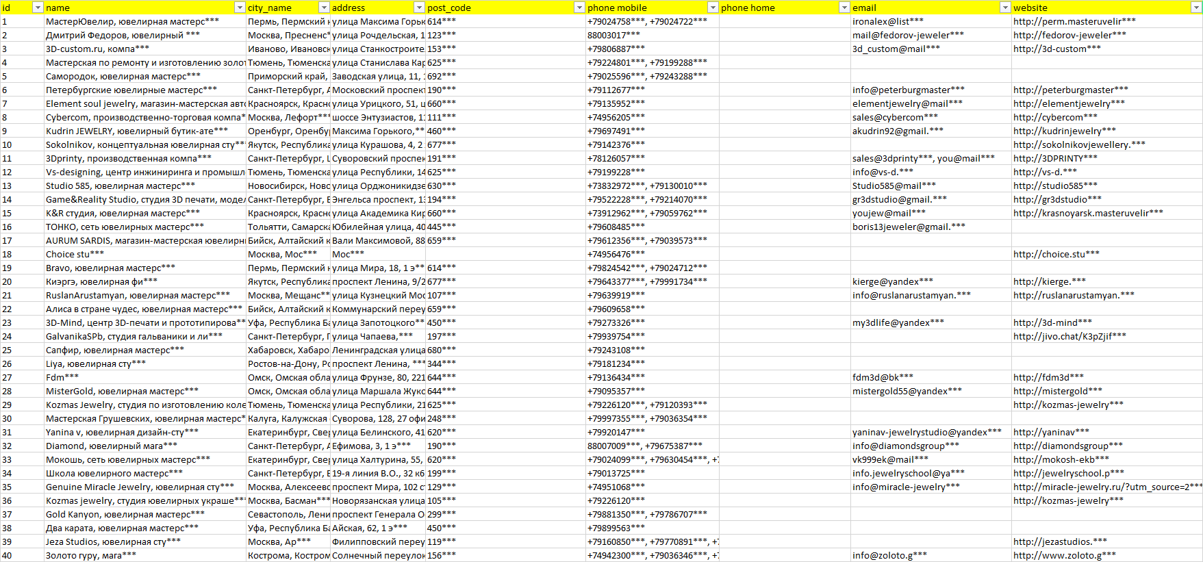 База компаний дизайн ювелирных изделий, вся РФ в формате Excel с эл. почтами, телефонами, сайтами, ссылками на соц сети, координатами и другой информацией. Скачайте демо версию, чтобы ознакомиться с данными.