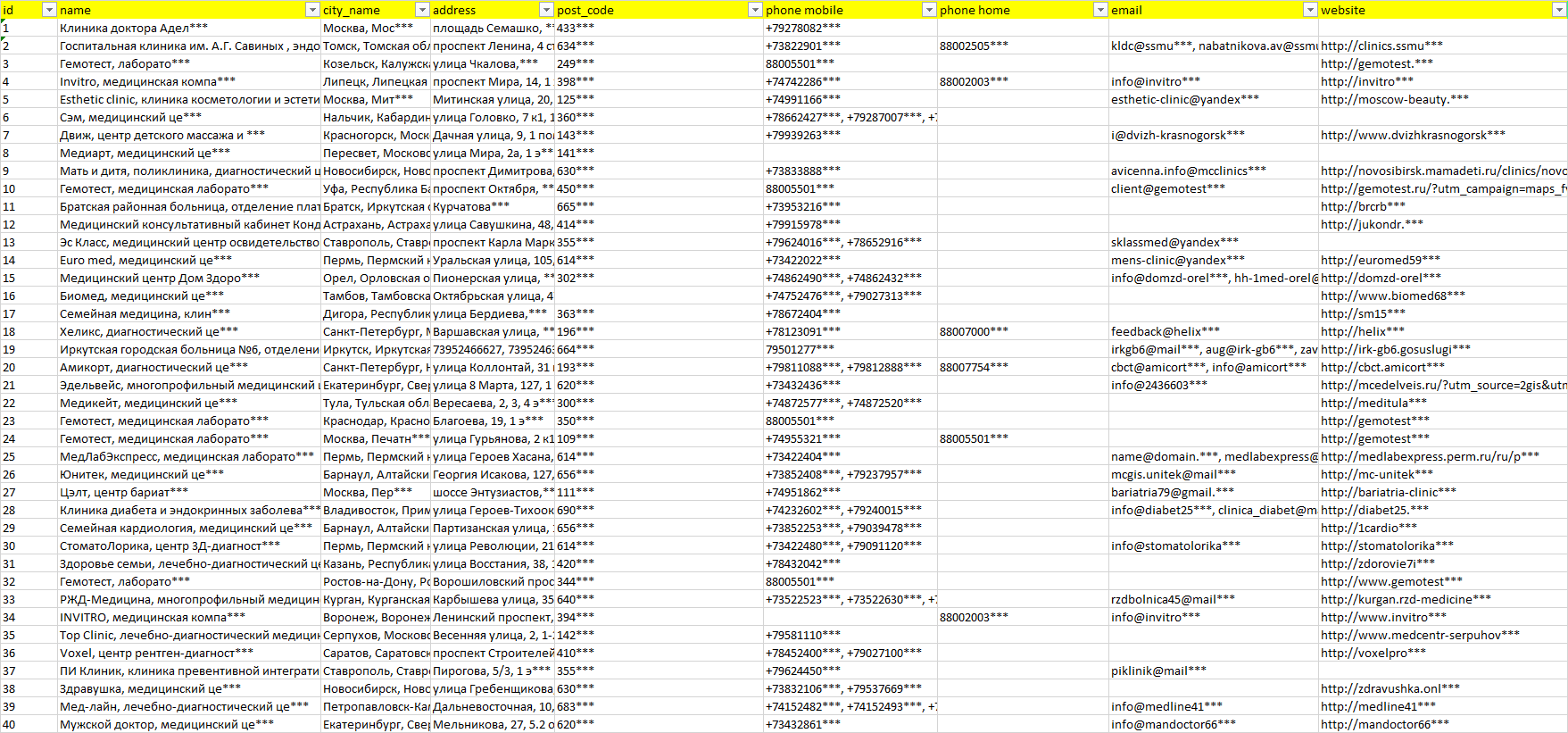 База организаций медицинская диагностика, вся Россия в формате Excel с эл. почтами, телефонами, сайтами, ссылками на соц сети, координатами и другой информацией. Скачайте демо версию, чтобы ознакомиться с данными.