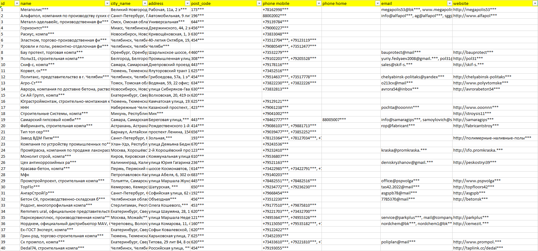 База компаний устройство промышленных и наливных полов, вся РФ в формате Excel с эл. почтами, телефонами, сайтами, ссылками на соц сети, координатами и другой информацией. Скачайте демо версию, чтобы ознакомиться с данными.