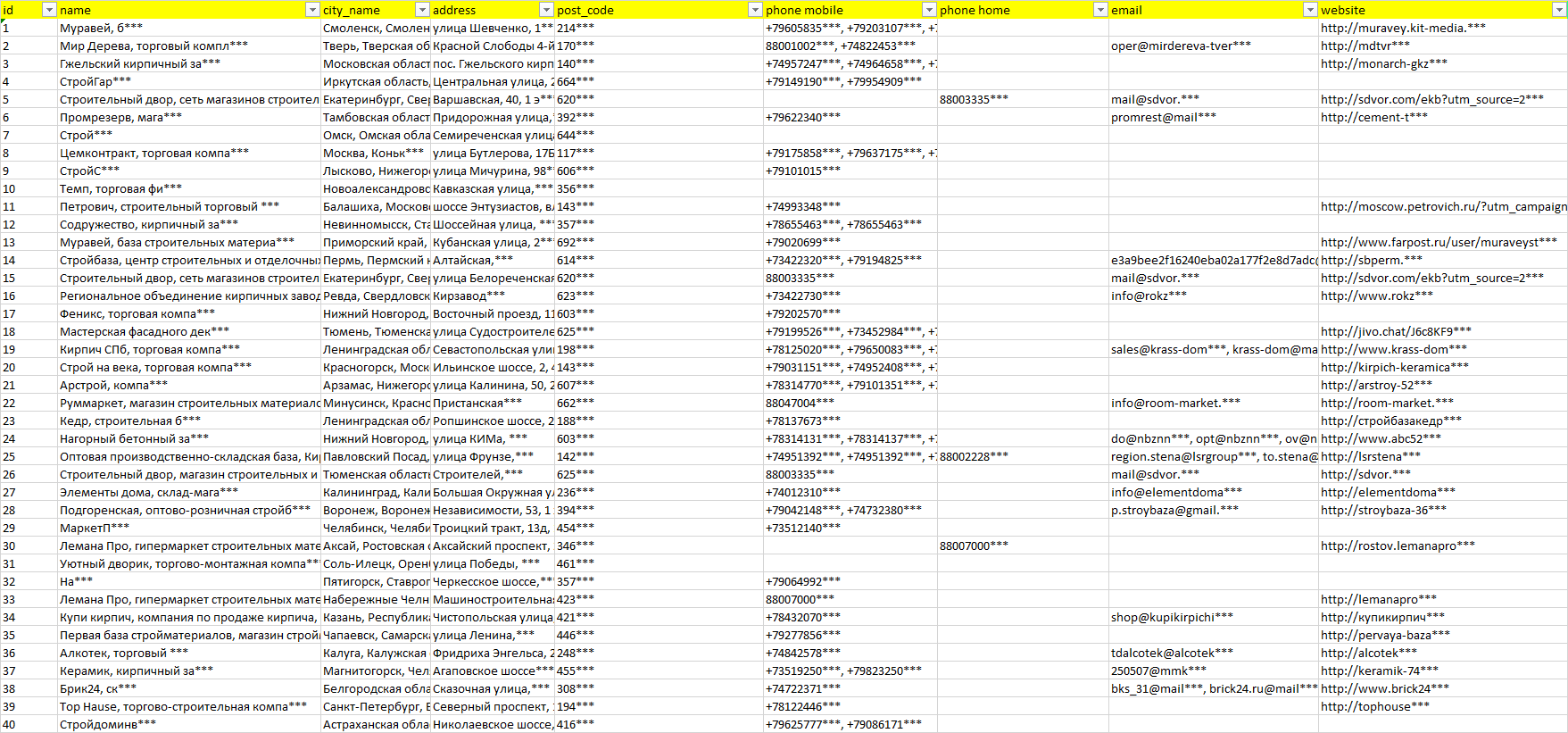 База организаций кирпич, вся Россия в формате Excel с эл. почтами, телефонами, сайтами, ссылками на соц сети, координатами и другой информацией. Скачайте демо версию, чтобы ознакомиться с данными.