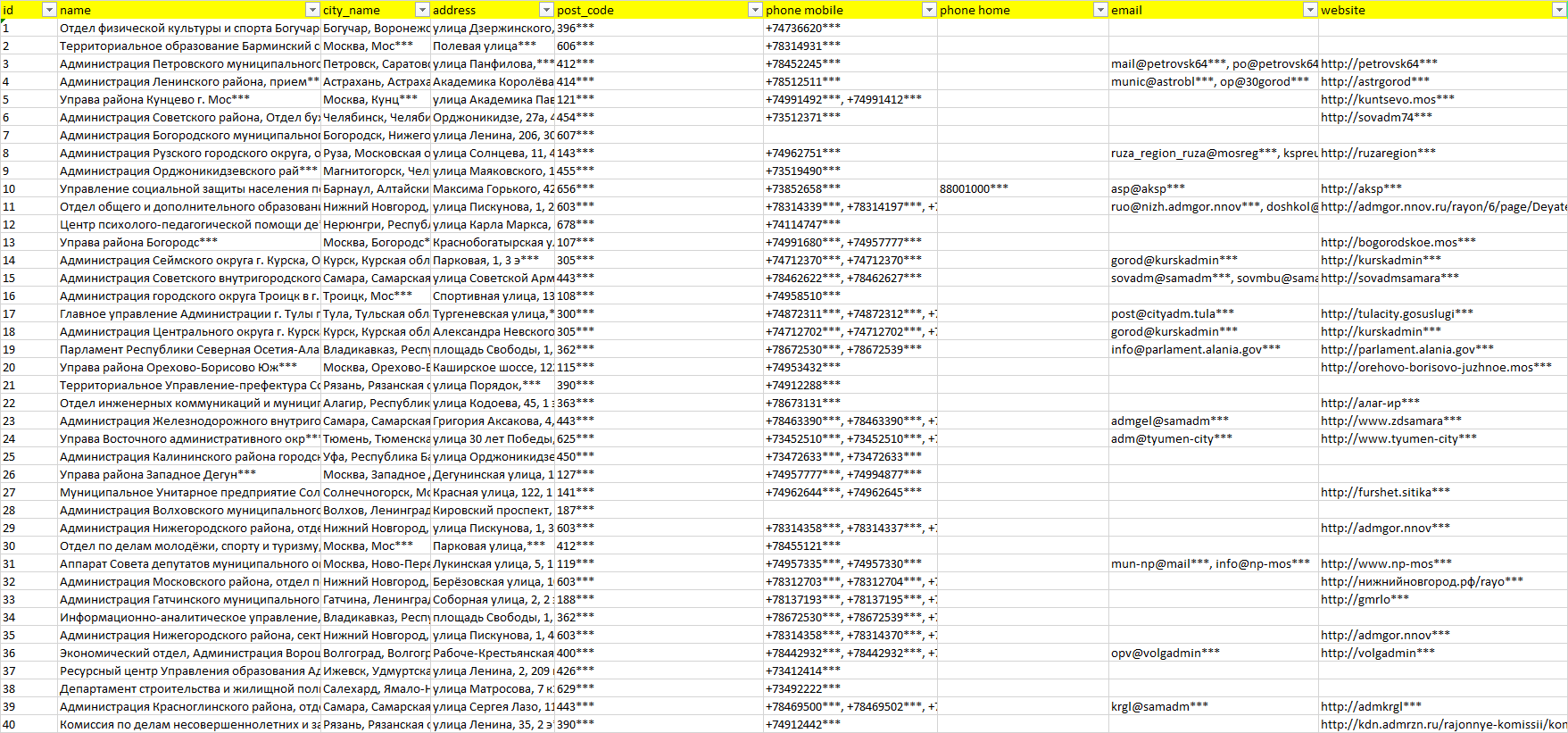 База компаний администрации районов округов городской власти, вся РФ в формате Excel с эл. почтами, телефонами, сайтами, ссылками на соц сети, координатами и другой информацией. Скачайте демо версию, чтобы ознакомиться с данными.