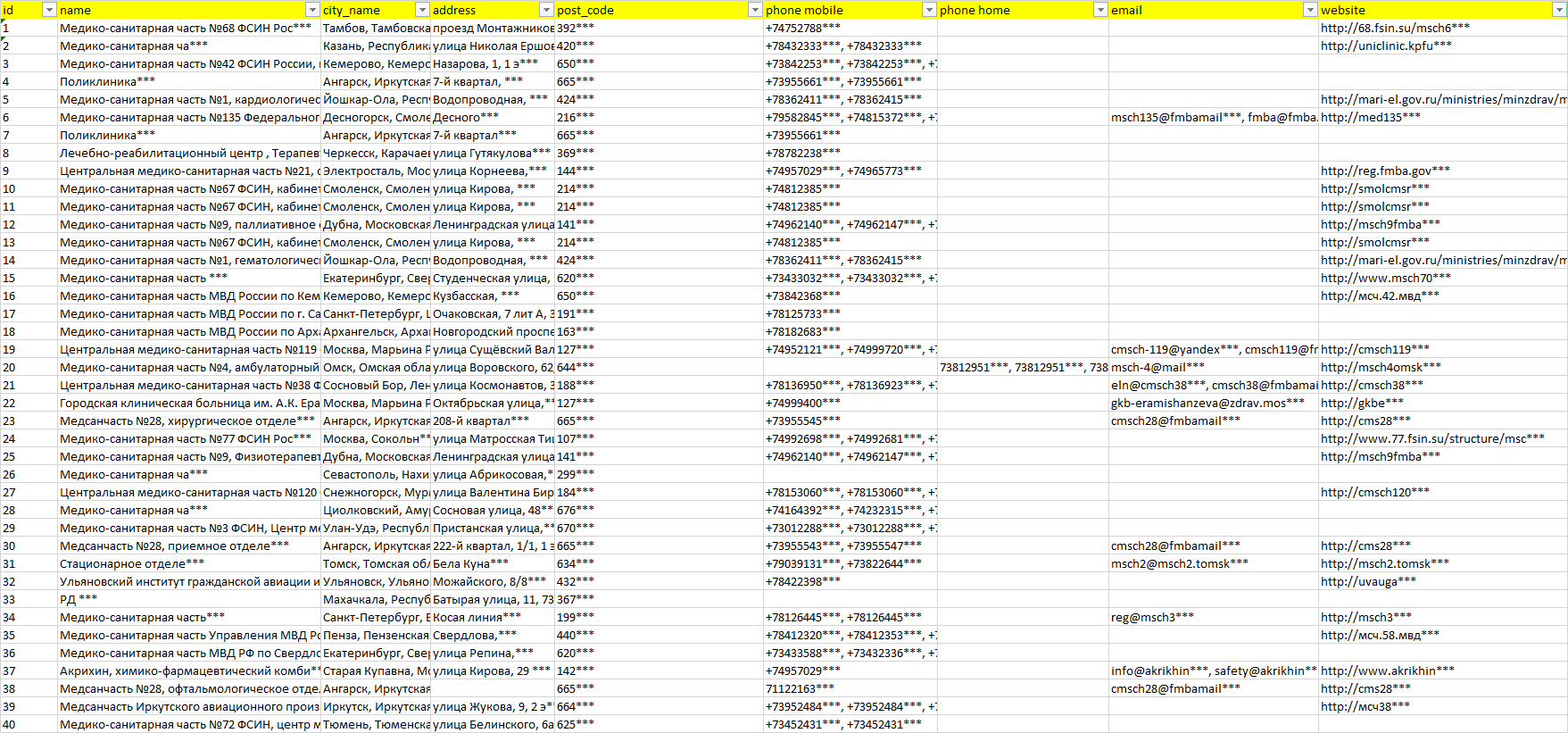 База организаций медсанчасти, вся Россия в формате Excel с эл. почтами, телефонами, сайтами, ссылками на соц сети, координатами и другой информацией. Скачайте демо версию, чтобы ознакомиться с данными.