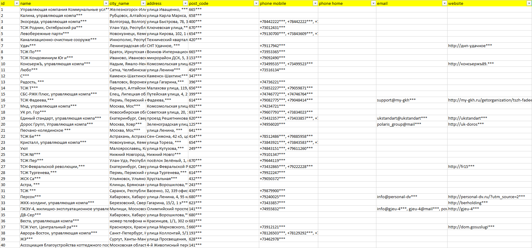 База компаний жилищно-коммунальные услуги, вся РФ в формате Excel с эл. почтами, телефонами, сайтами, ссылками на соц сети, координатами и другой информацией. Скачайте демо версию, чтобы ознакомиться с данными.