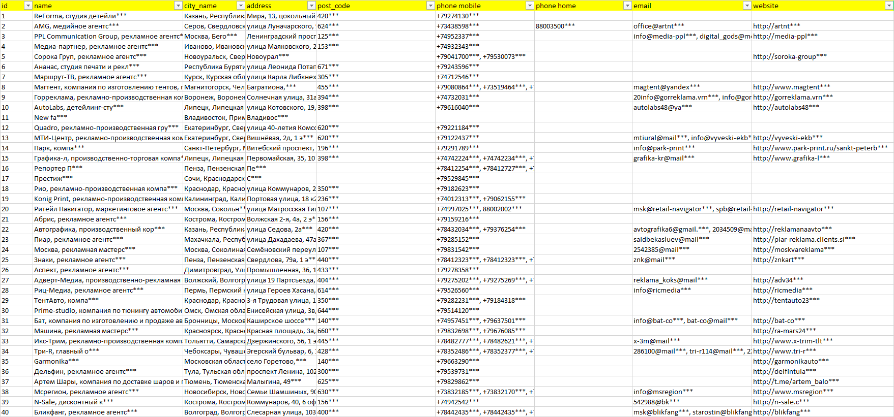 База организаций реклама на транспорте, вся Россия в формате Excel с эл. почтами, телефонами, сайтами, ссылками на соц сети, координатами и другой информацией. Скачайте демо версию, чтобы ознакомиться с данными.