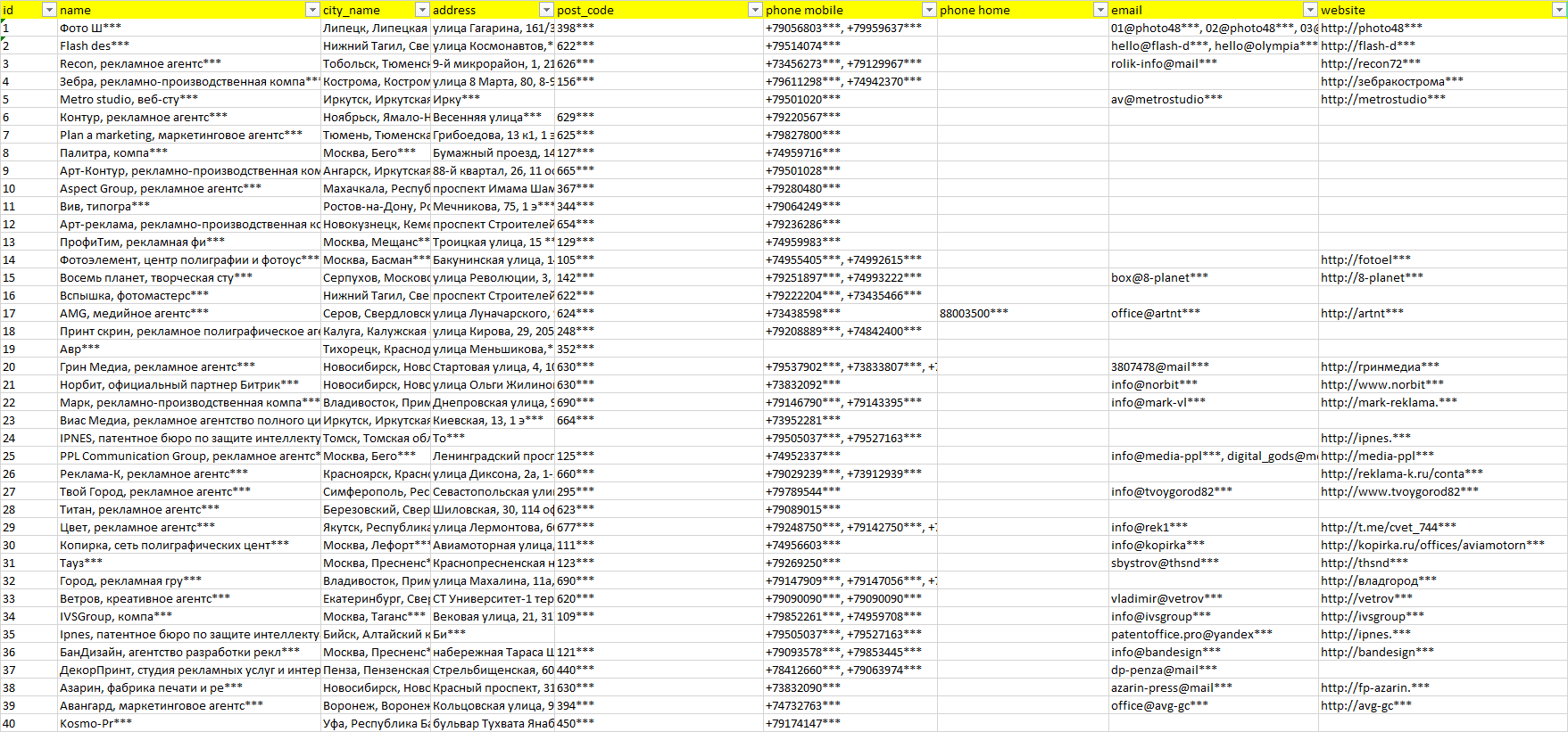 База компаний дизайн рекламы, вся РФ в формате Excel с эл. почтами, телефонами, сайтами, ссылками на соц сети, координатами и другой информацией. Скачайте демо версию, чтобы ознакомиться с данными.
