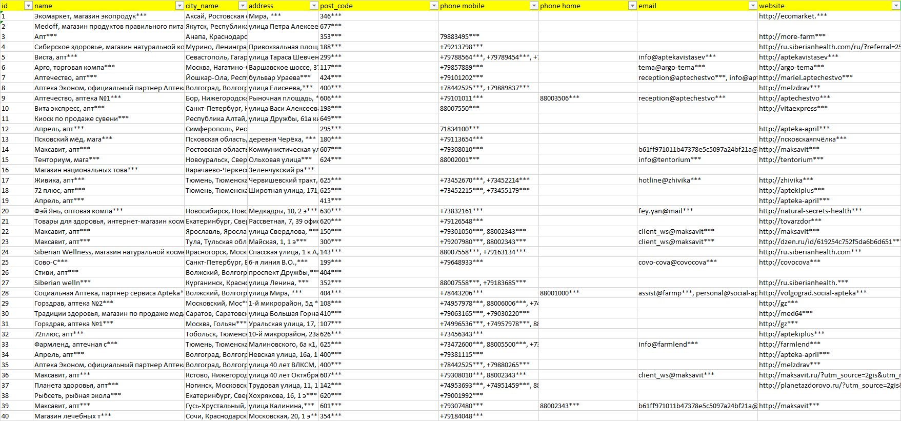 База компаний фитопродукция, вся РФ в формате Excel с эл. почтами, телефонами, сайтами, ссылками на соц сети, координатами и другой информацией. Скачайте демо версию, чтобы ознакомиться с данными.