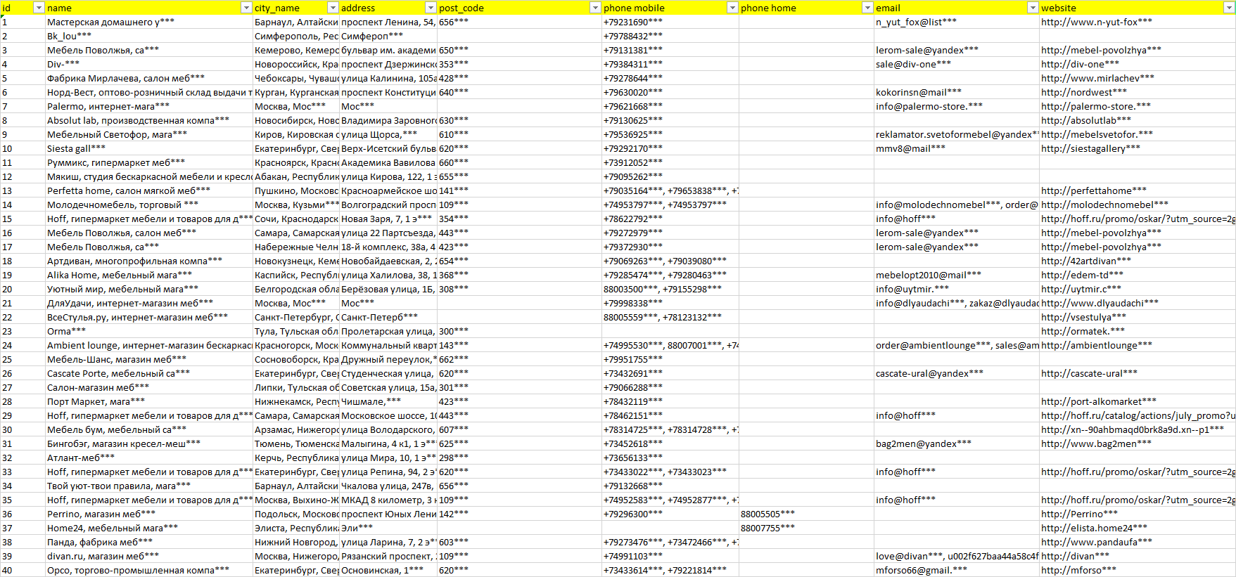 База организаций бескаркасная мебель, вся Россия в формате Excel с эл. почтами, телефонами, сайтами, ссылками на соц сети, координатами и другой информацией. Скачайте демо версию, чтобы ознакомиться с данными.