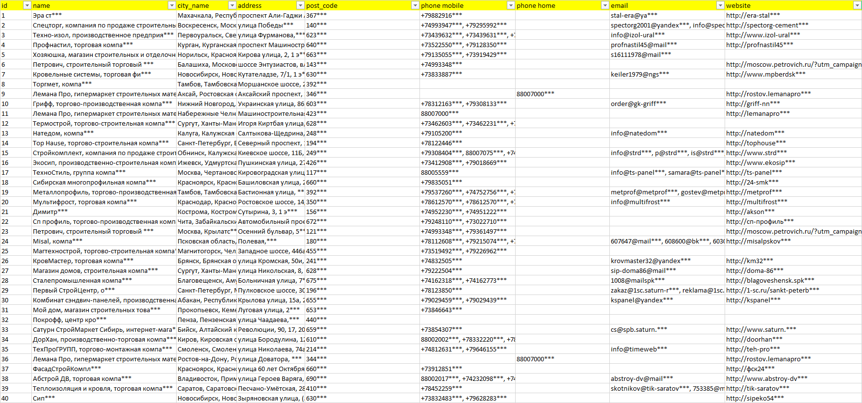 Мы автоматически собираем такие данные с различных открытых источников, обрабатываем, структурирует и упорядочиваем их, предоставляя пользователю возможность скачать результат в формате Excel. По принципу работы наш сервис аналогичен поисковым системам, таким как Google или Яндекс, но с возможностью экспорта найденной информации в удобном табличном виде.