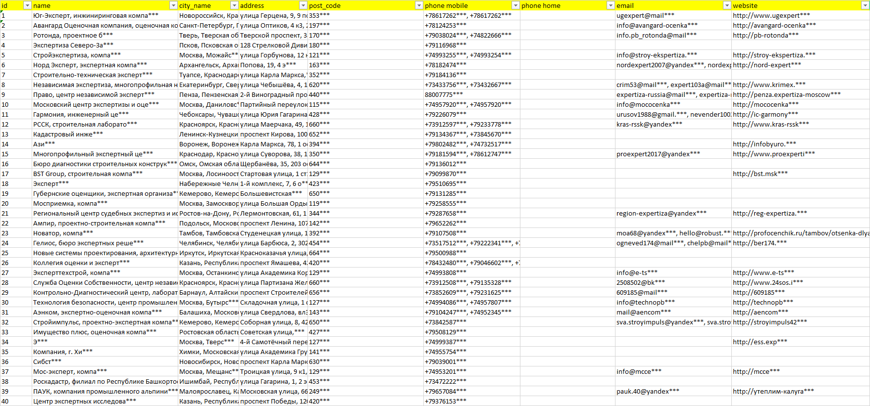 База организаций экспертиза зданий и сооружений, вся Россия в формате Excel с эл. почтами, телефонами, сайтами, ссылками на соц сети, координатами и другой информацией. Скачайте демо версию, чтобы ознакомиться с данными.