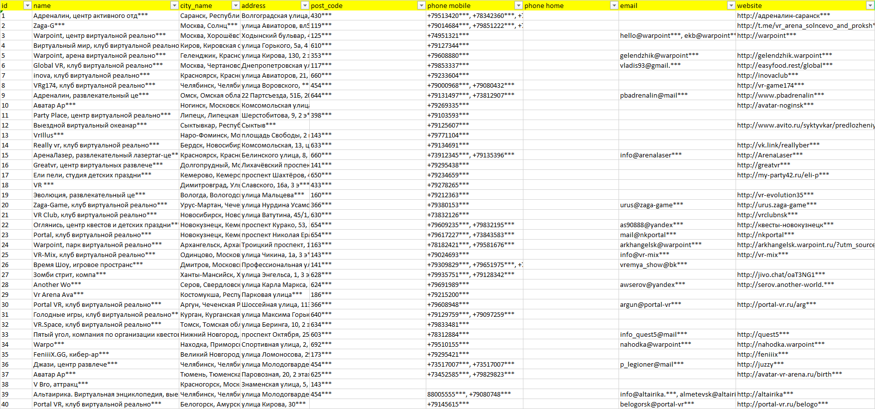 База организаций центры виртуальной реальности, вся Россия в формате Excel с эл. почтами, телефонами, сайтами, ссылками на соц сети, координатами и другой информацией. Скачайте демо версию, чтобы ознакомиться с данными.
