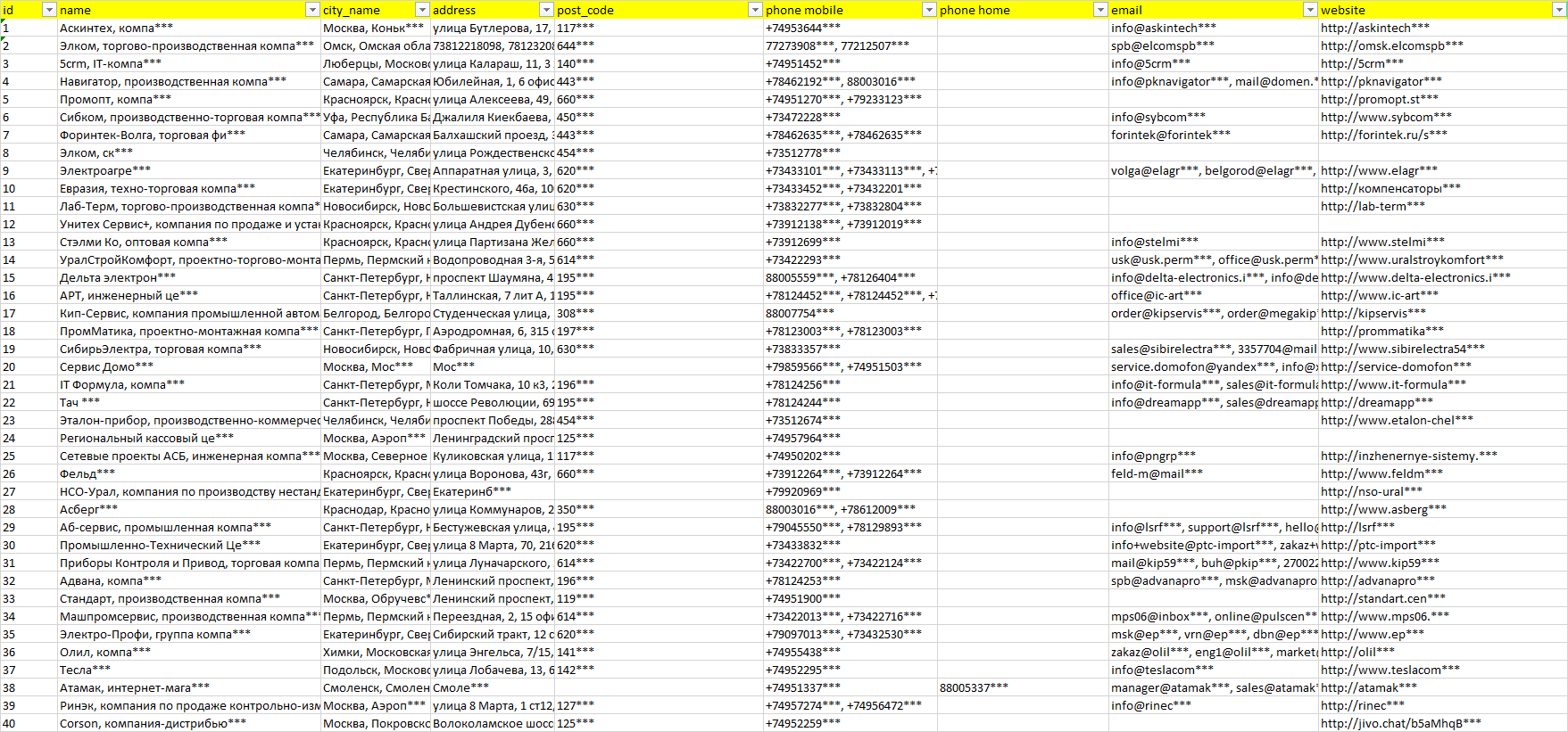Мы автоматически собираем такие данные с различных открытых источников, обрабатываем, структурирует и упорядочиваем их, предоставляя пользователю возможность скачать результат в формате Excel. По принципу работы наш сервис аналогичен поисковым системам, таким как Google или Яндекс, но с возможностью экспорта найденной информации в удобном табличном виде.