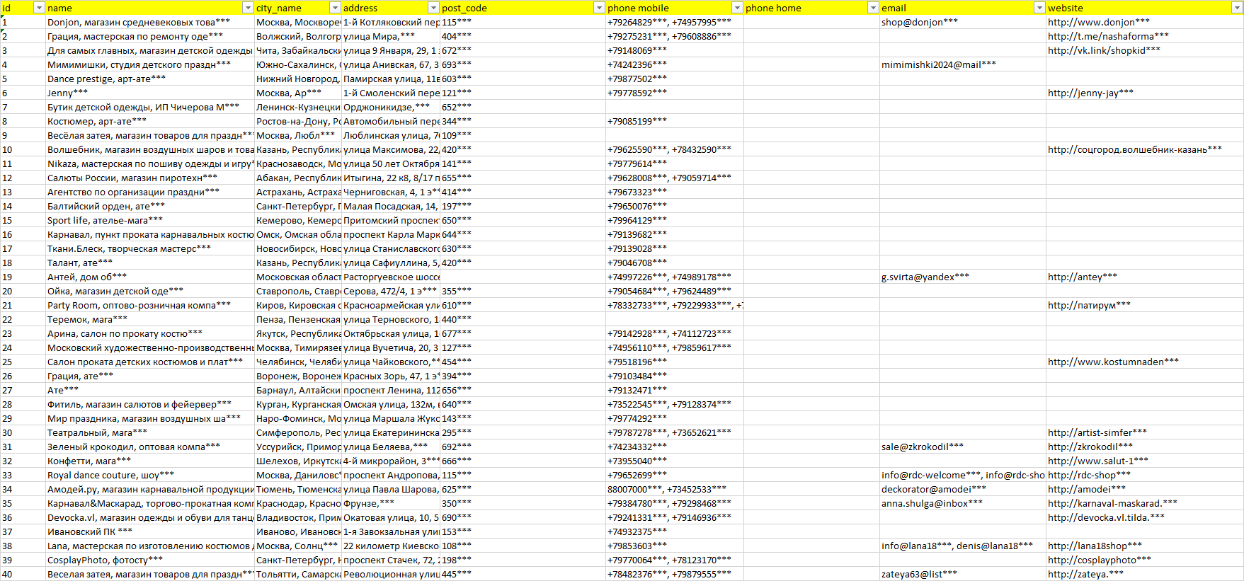 База компаний сценические и карнавальные костюмы, вся РФ в формате Excel с эл. почтами, телефонами, сайтами, ссылками на соц сети, координатами и другой информацией. Скачайте демо версию, чтобы ознакомиться с данными.