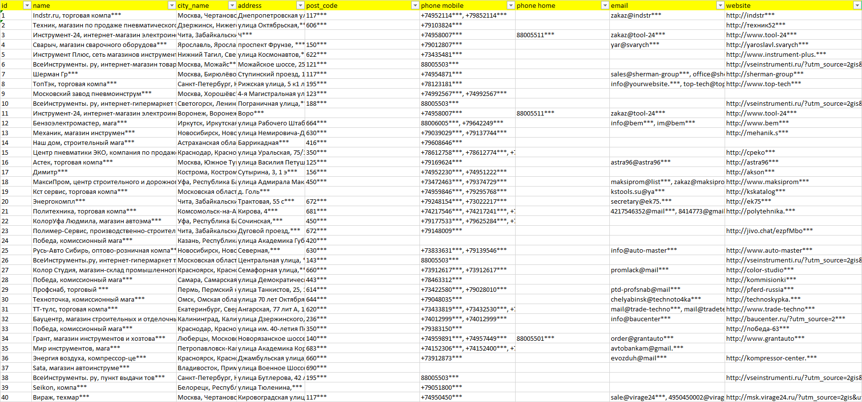 База организаций пневмоинструмент, вся Россия в формате Excel с эл. почтами, телефонами, сайтами, ссылками на соц сети, координатами и другой информацией. Скачайте демо версию, чтобы ознакомиться с данными.