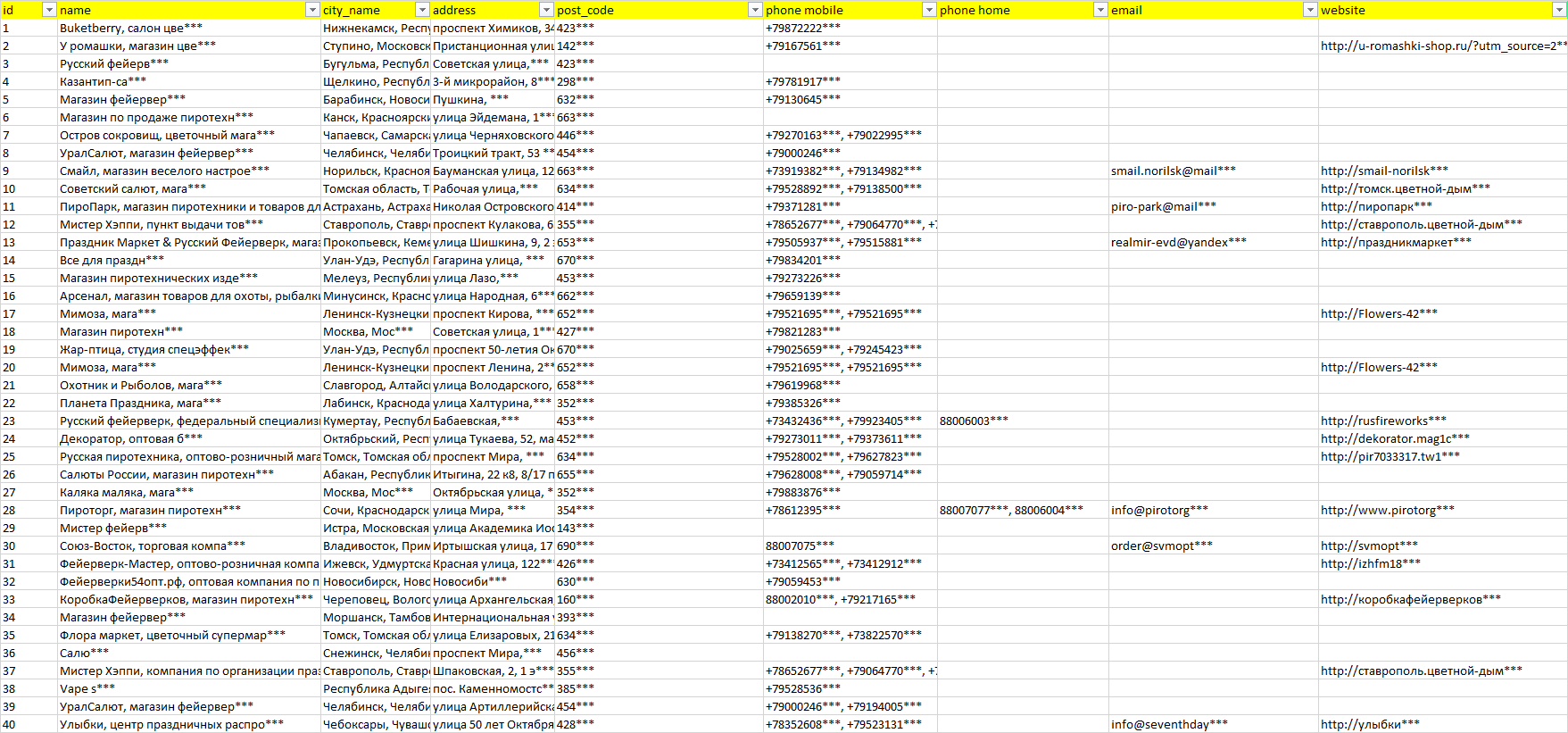 База компаний пиротехника, вся РФ в формате Excel с эл. почтами, телефонами, сайтами, ссылками на соц сети, координатами и другой информацией. Скачайте демо версию, чтобы ознакомиться с данными.