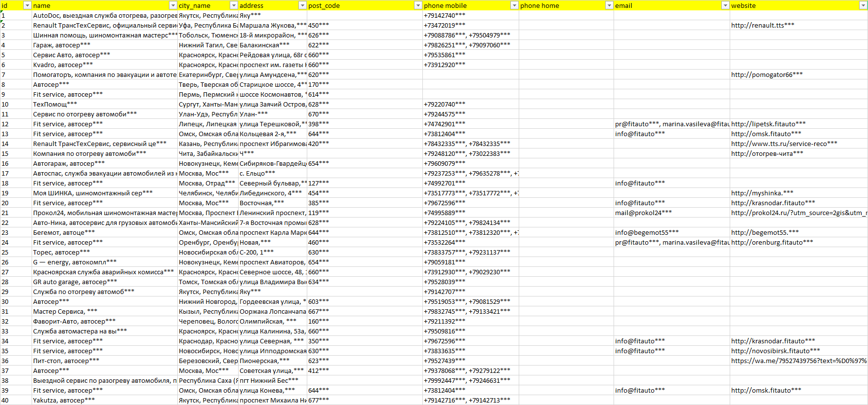 База организаций отогрев автомобилей, вся Россия в формате Excel с эл. почтами, телефонами, сайтами, ссылками на соц сети, координатами и другой информацией. Скачайте демо версию, чтобы ознакомиться с данными.