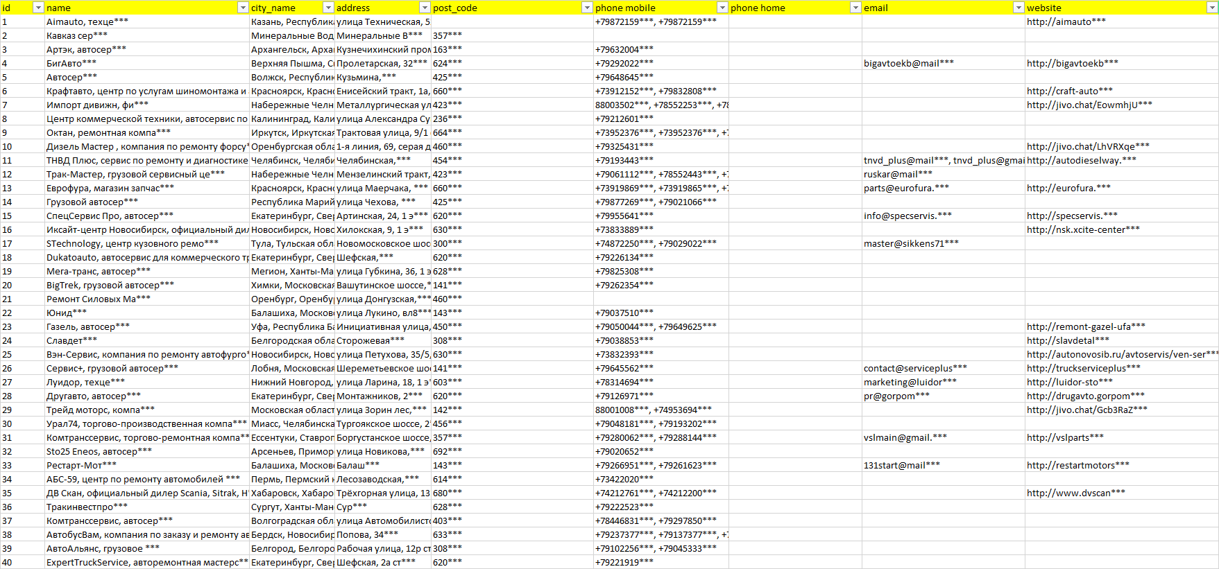 База организаций грузовой автосервис, вся Россия в формате Excel с эл. почтами, телефонами, сайтами, ссылками на соц сети, координатами и другой информацией. Скачайте демо версию, чтобы ознакомиться с данными.