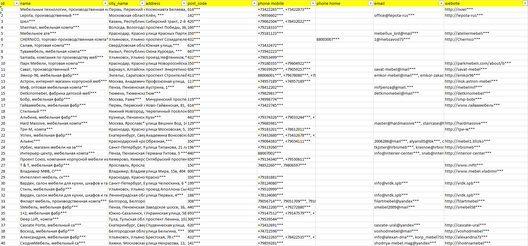 База организаций мебельные фабрики, вся Россия в формате Excel с эл. почтами, телефонами, сайтами, ссылками на соц сети, координатами и другой информацией. Скачайте демо версию, чтобы ознакомиться с данными.
