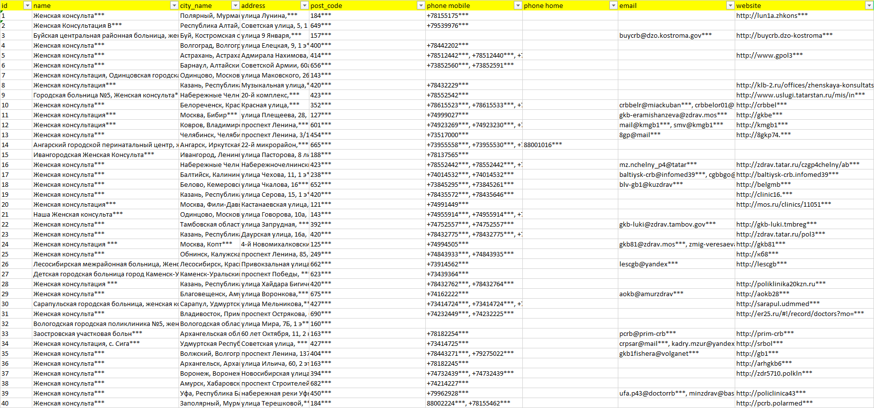 База компаний женские консультации, вся РФ в формате Excel с эл. почтами, телефонами, сайтами, ссылками на соц сети, координатами и другой информацией. Скачайте демо версию, чтобы ознакомиться с данными.