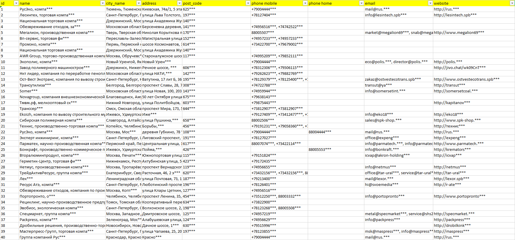 База компаний оборудование для утилизации отходов, вся РФ в формате Excel с эл. почтами, телефонами, сайтами, ссылками на соц сети, координатами и другой информацией. Скачайте демо версию, чтобы ознакомиться с данными.