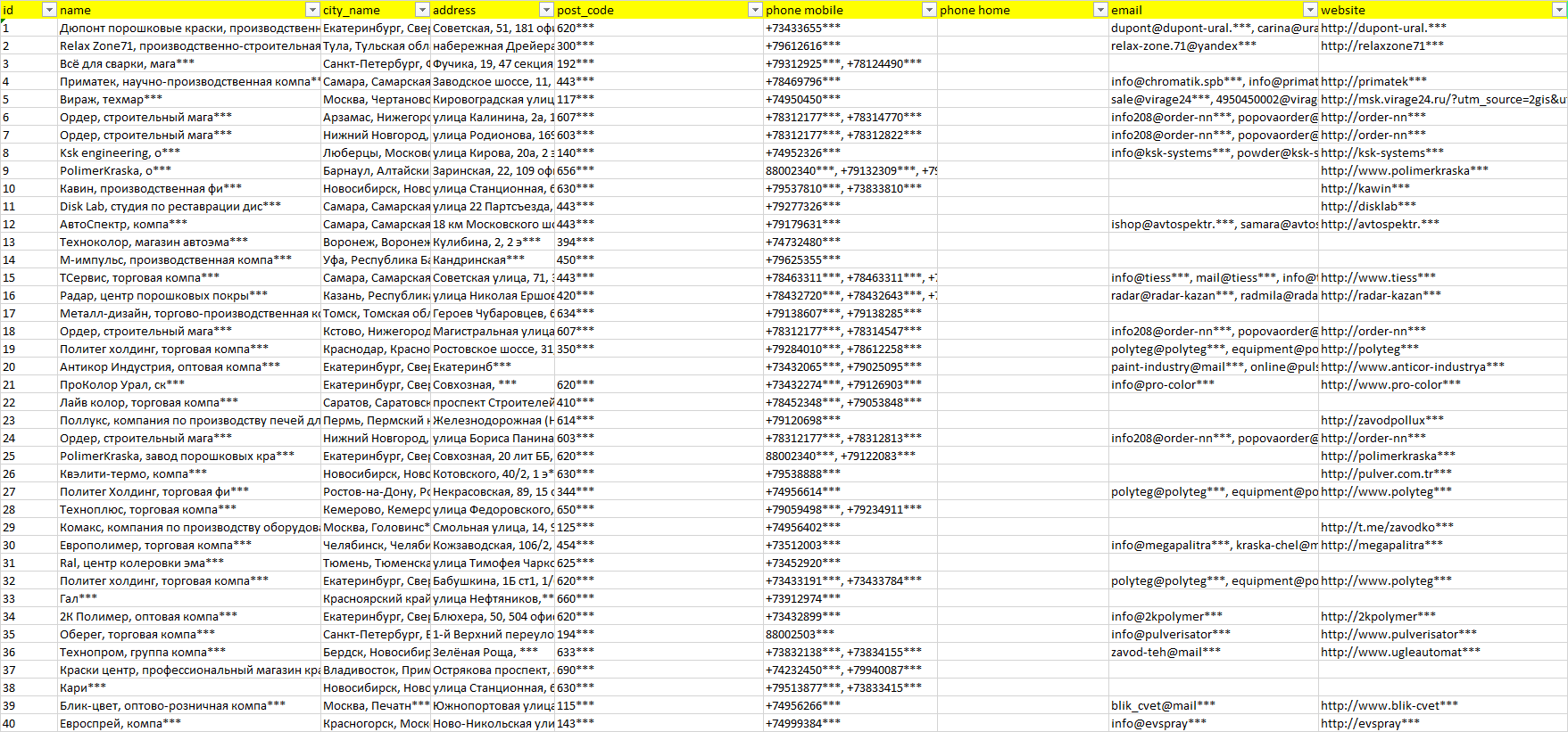 База компаний оборудование для полимерной окраски, вся РФ в формате Excel с эл. почтами, телефонами, сайтами, ссылками на соц сети, координатами и другой информацией. Скачайте демо версию, чтобы ознакомиться с данными.