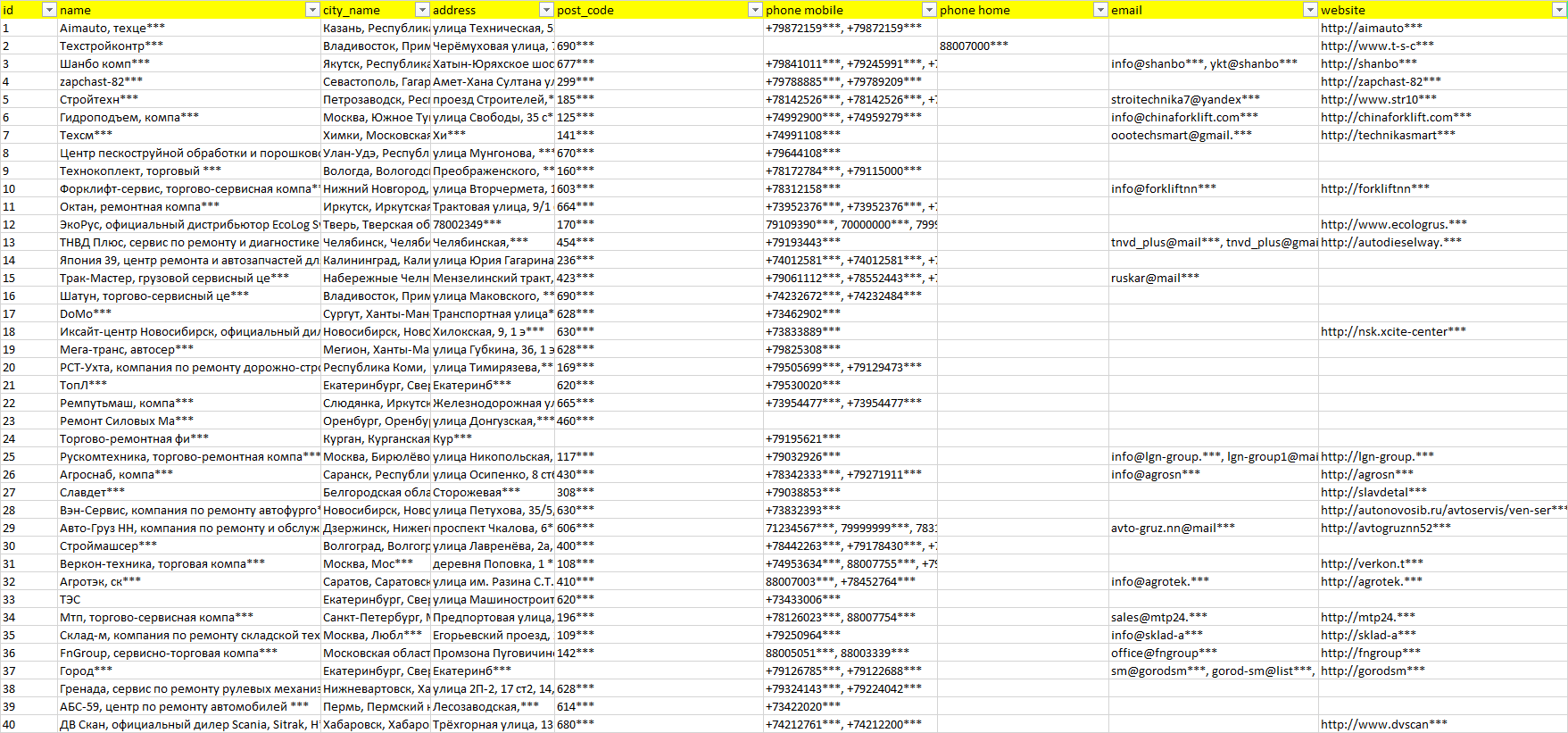 База организаций ремонт спецтехники, вся Россия в формате Excel с эл. почтами, телефонами, сайтами, ссылками на соц сети, координатами и другой информацией. Скачайте демо версию, чтобы ознакомиться с данными.
