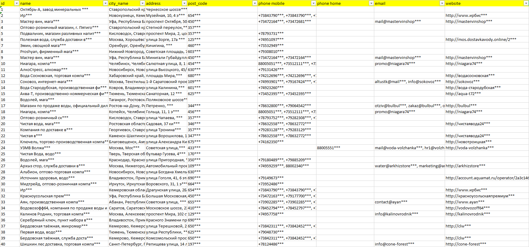 База организаций минеральная вода, вся Россия в формате Excel с эл. почтами, телефонами, сайтами, ссылками на соц сети, координатами и другой информацией. Скачайте демо версию, чтобы ознакомиться с данными.