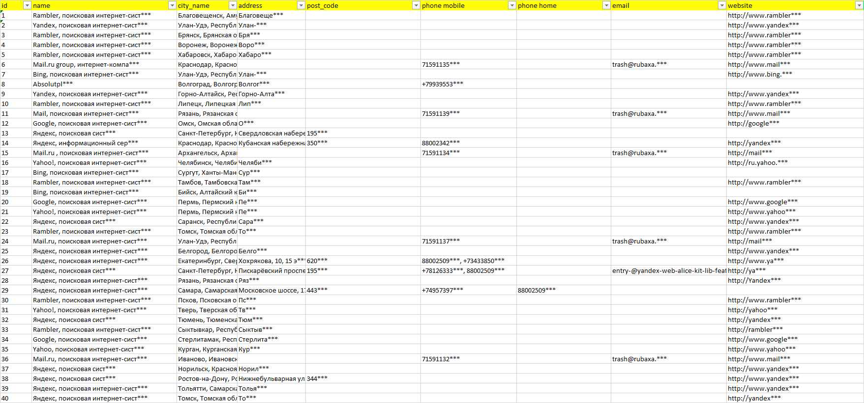 База организаций поисковые интернет-системы, вся Россия в формате Excel с эл. почтами, телефонами, сайтами, ссылками на соц сети, координатами и другой информацией. Скачайте демо версию, чтобы ознакомиться с данными.
