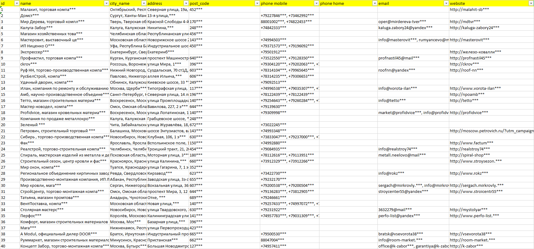 База компаний заборы и ограждения, вся РФ в формате Excel с эл. почтами, телефонами, сайтами, ссылками на соц сети, координатами и другой информацией. Скачайте демо версию, чтобы ознакомиться с данными.