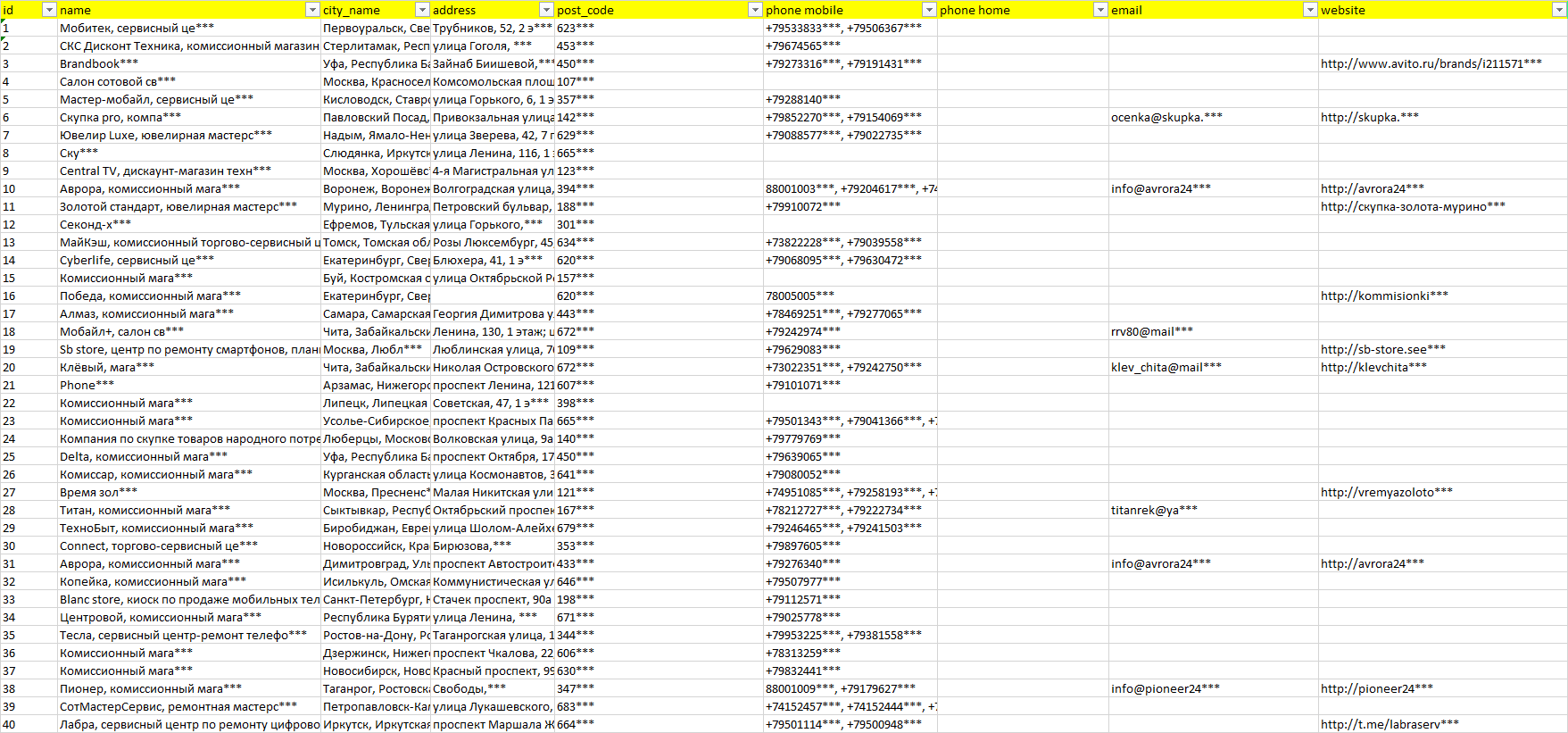 База компаний комиссионные магазины, вся РФ в формате Excel с эл. почтами, телефонами, сайтами, ссылками на соц сети, координатами и другой информацией. Скачайте демо версию, чтобы ознакомиться с данными.