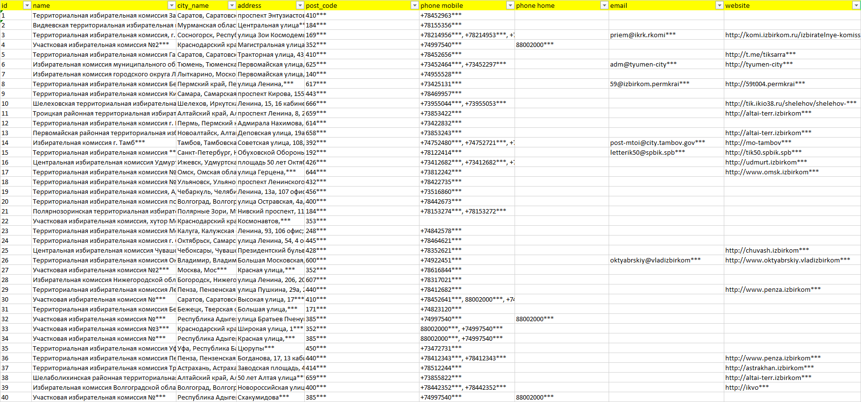 База организаций избирательные комиссии, вся Россия в формате Excel с эл. почтами, телефонами, сайтами, ссылками на соц сети, координатами и другой информацией. Скачайте демо версию, чтобы ознакомиться с данными.