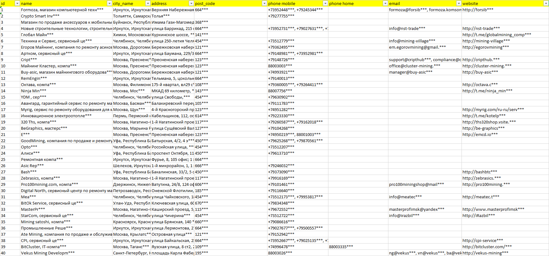 База организаций оборудование для майнинга, вся Россия в формате Excel с эл. почтами, телефонами, сайтами, ссылками на соц сети, координатами и другой информацией. Скачайте демо версию, чтобы ознакомиться с данными.