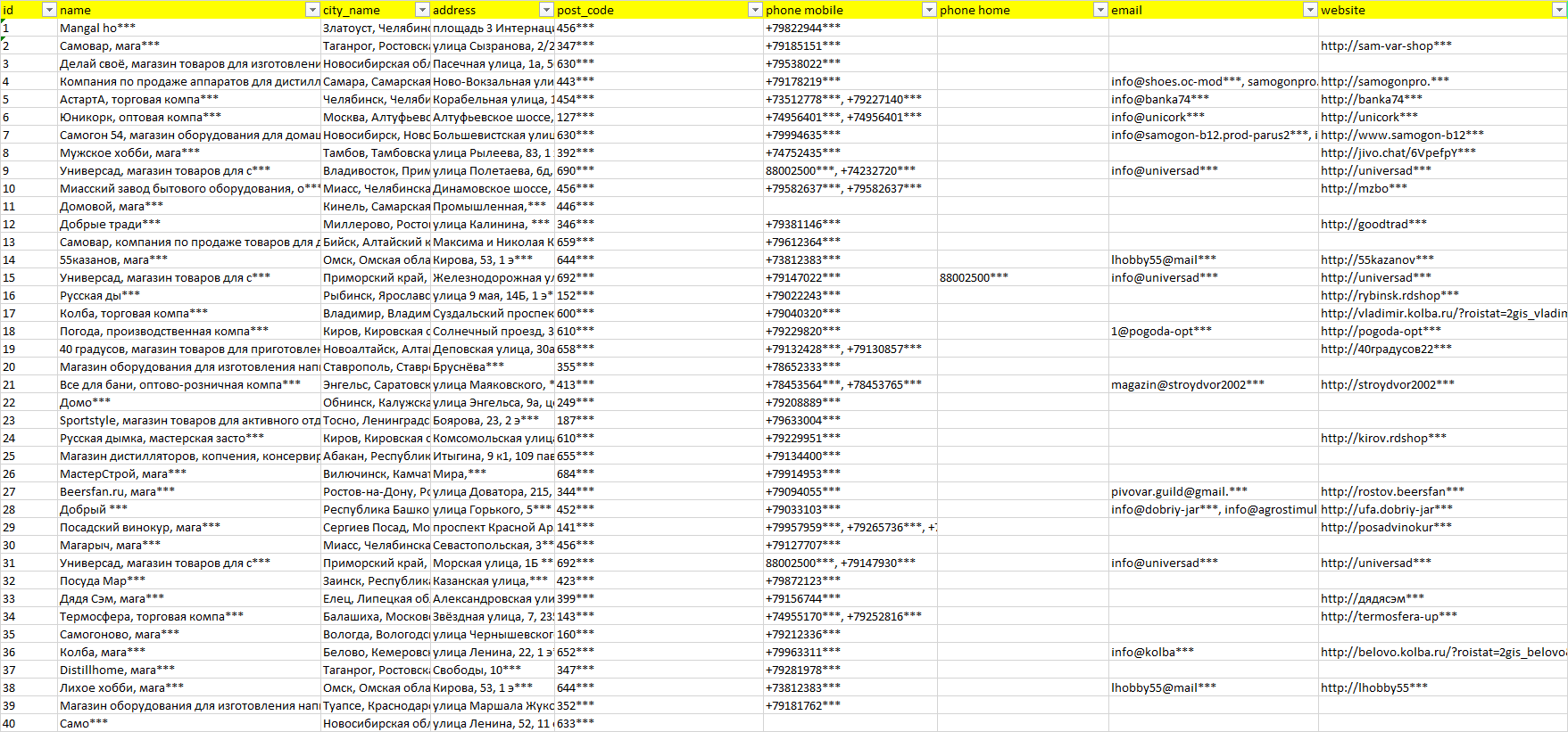 База компаний товары для пиво- и самогоноварения, вся РФ в формате Excel с эл. почтами, телефонами, сайтами, ссылками на соц сети, координатами и другой информацией. Скачайте демо версию, чтобы ознакомиться с данными.