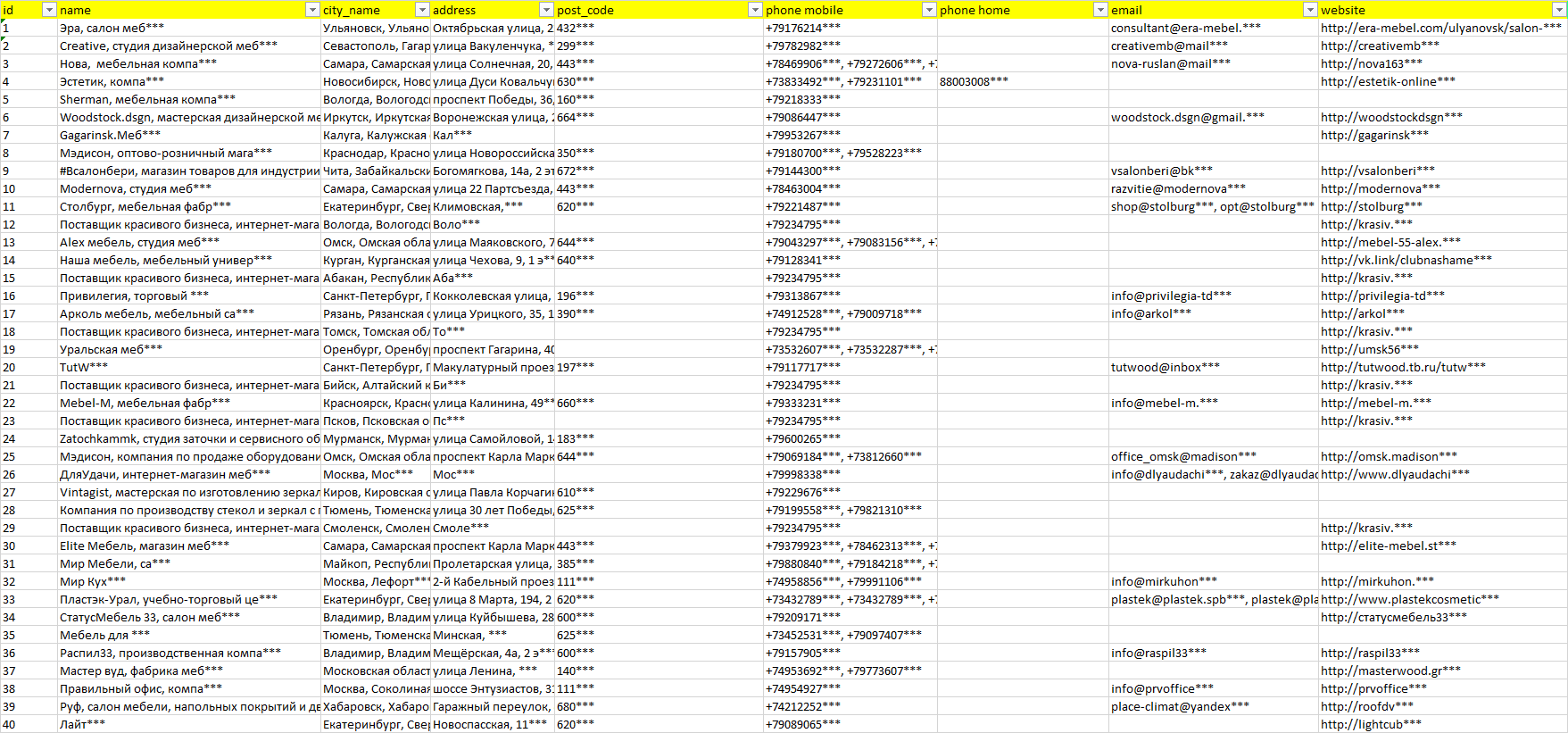 База организаций мебель для салонов красоты, вся Россия в формате Excel с эл. почтами, телефонами, сайтами, ссылками на соц сети, координатами и другой информацией. Скачайте демо версию, чтобы ознакомиться с данными.