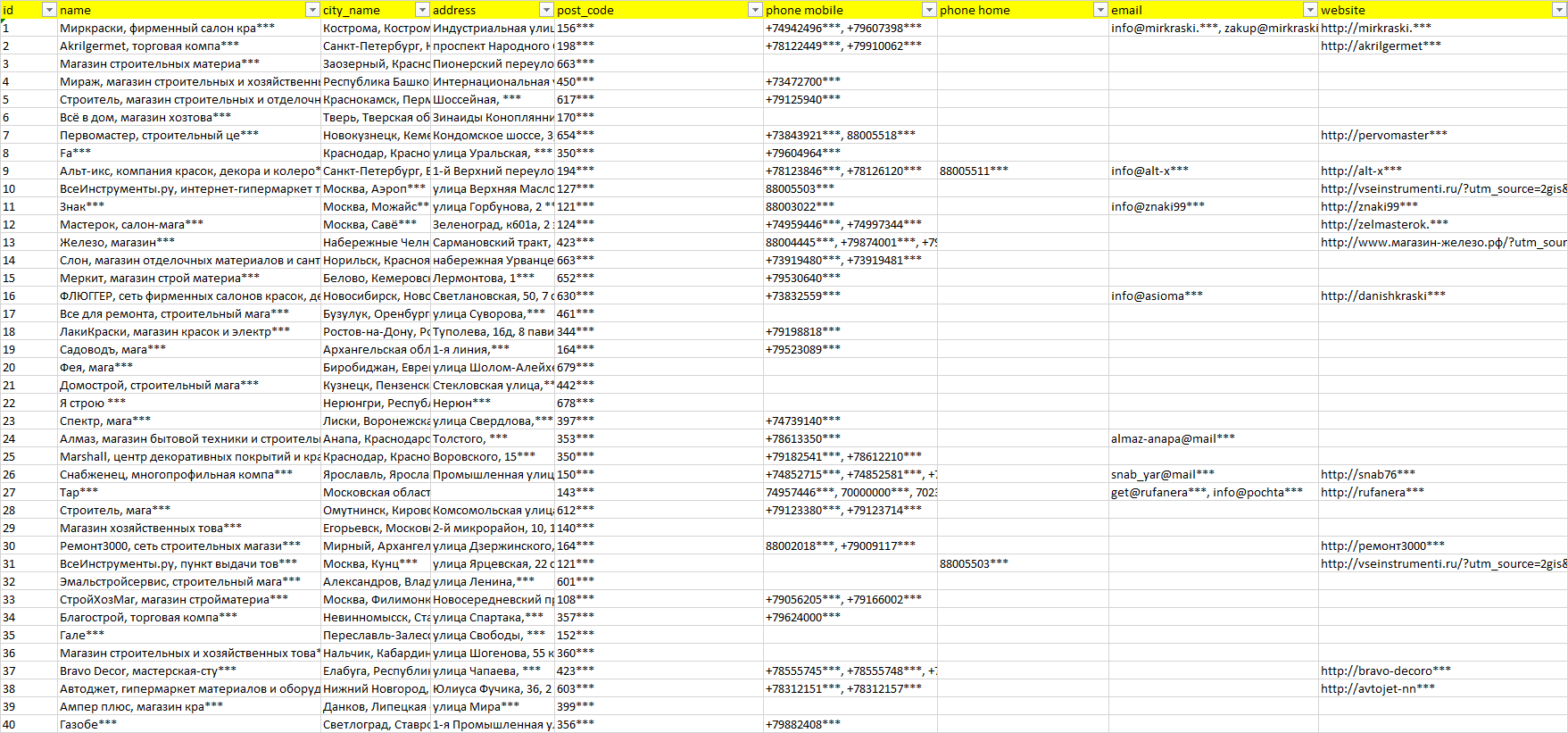 База организаций лаки и краски, вся Россия в формате Excel с эл. почтами, телефонами, сайтами, ссылками на соц сети, координатами и другой информацией. Скачайте демо версию, чтобы ознакомиться с данными.