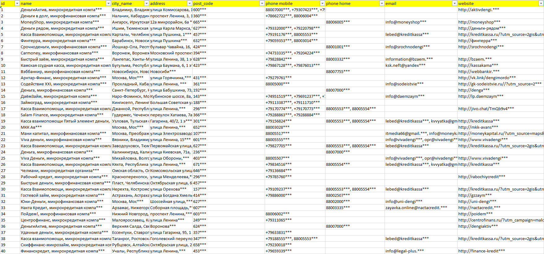 База организаций микрофинансирование, вся Россия в формате Excel с эл. почтами, телефонами, сайтами, ссылками на соц сети, координатами и другой информацией. Скачайте демо версию, чтобы ознакомиться с данными.