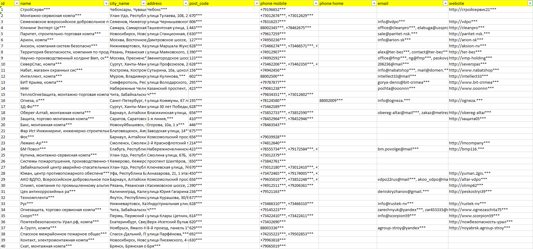 База организаций огнезащитная обработка, вся Россия в формате Excel с эл. почтами, телефонами, сайтами, ссылками на соц сети, координатами и другой информацией. Скачайте демо версию, чтобы ознакомиться с данными.