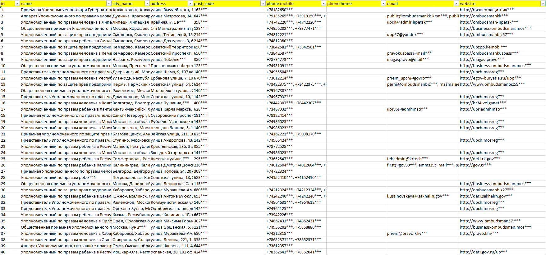 База компаний приёмные уполномоченных по правам человека, вся РФ в формате Excel с эл. почтами, телефонами, сайтами, ссылками на соц сети, координатами и другой информацией. Скачайте демо версию, чтобы ознакомиться с данными.