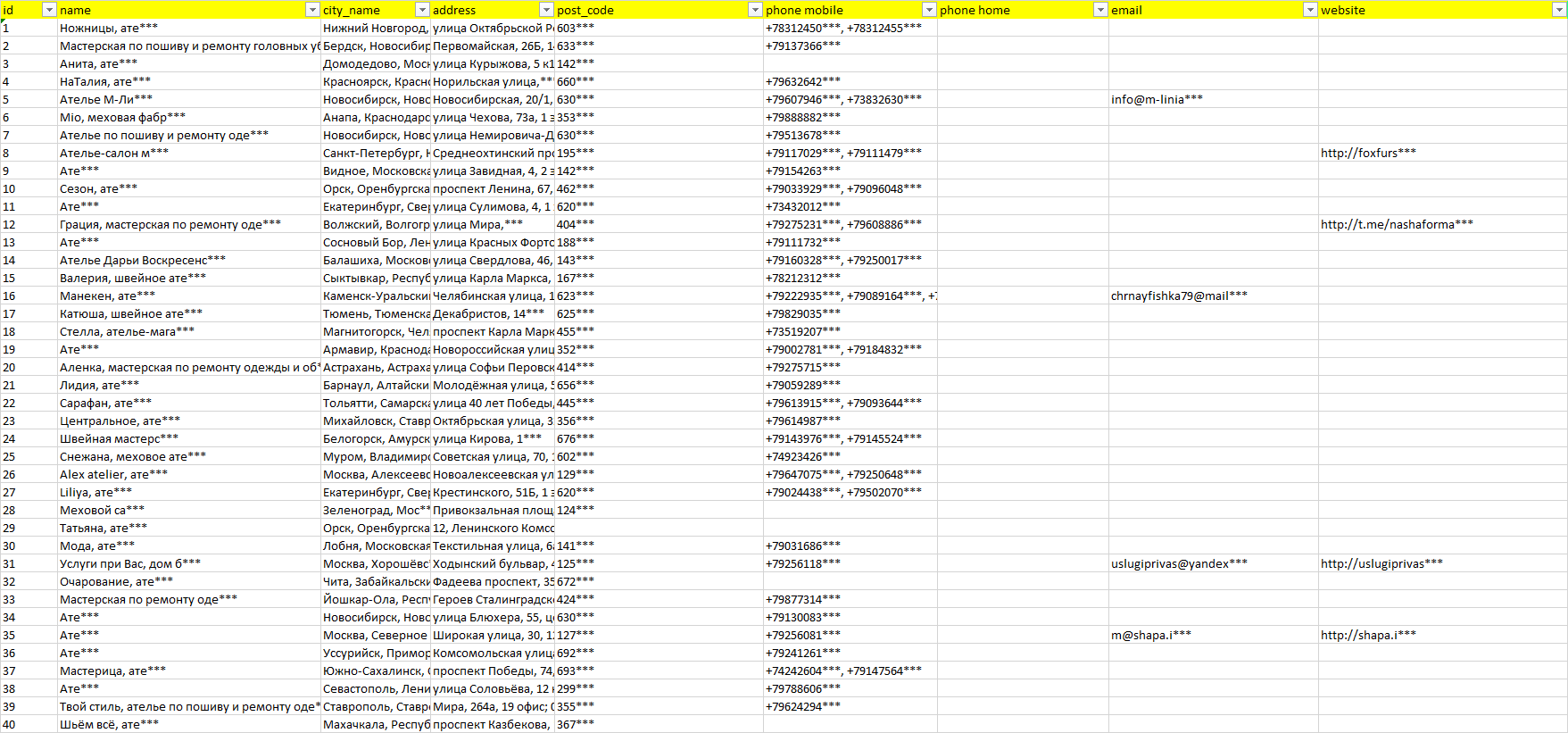 База компаний ателье меха и кожи, вся РФ в формате Excel с эл. почтами, телефонами, сайтами, ссылками на соц сети, координатами и другой информацией. Скачайте демо версию, чтобы ознакомиться с данными.