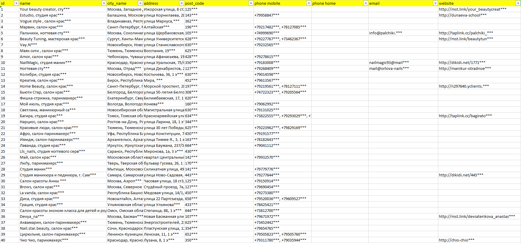 База организаций ногтевые студии, вся Россия в формате Excel с эл. почтами, телефонами, сайтами, ссылками на соц сети, координатами и другой информацией. Скачайте демо версию, чтобы ознакомиться с данными.