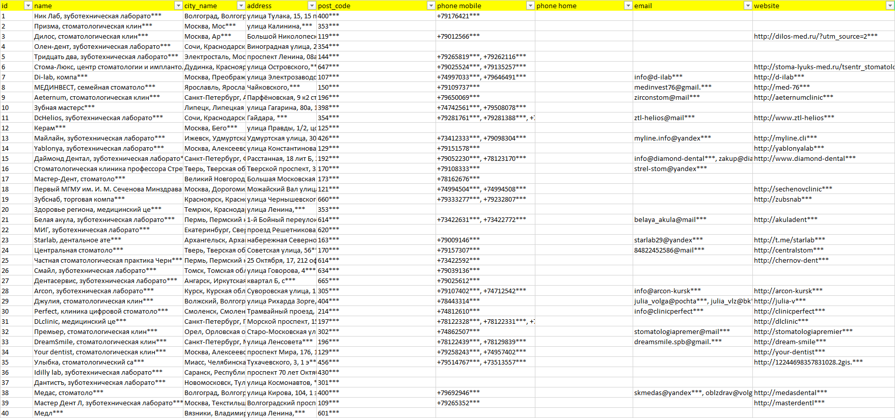 База компаний зуботехнические лаборатории, вся РФ в формате Excel с эл. почтами, телефонами, сайтами, ссылками на соц сети, координатами и другой информацией. Скачайте демо версию, чтобы ознакомиться с данными.
